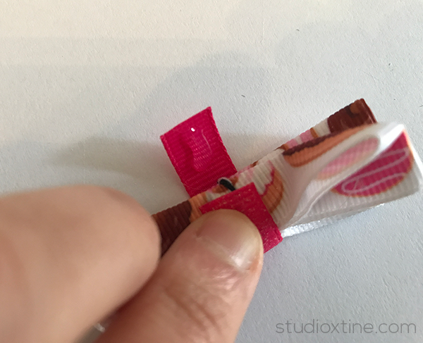 - Place a small drop of hot glue on the bottom of the band and quickly press down onto hair clip so that the banded hair bows are pretty centered over the clip.
