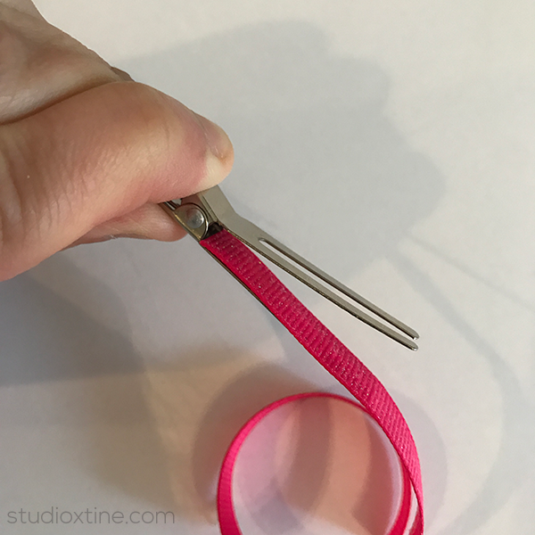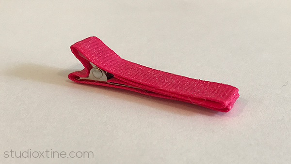 - Turn on hot glue gun to heat glue stick. First, we will glue the 3/8″ ribbon to the double prong clip starting on the inside bottom.