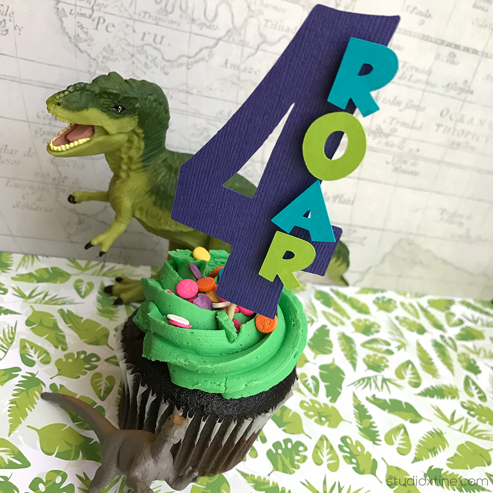 Did you know you don’t always need a SDS design to make your Silhouette creations? Use your imagination! This particular cupcake topper is super easy to make and great for those leftover paper scraps! With the Text tool, I typed out “4” and “ROAR” and sent it to Silhouette to cut. Use different colored and/or textured paper to make your project colorful and eye-catching. Again, I used dimensional foam adhesive behind the letters to give the cupcake topper a 3D look.