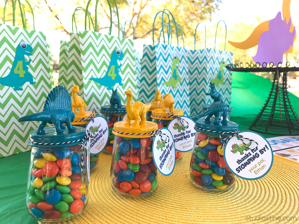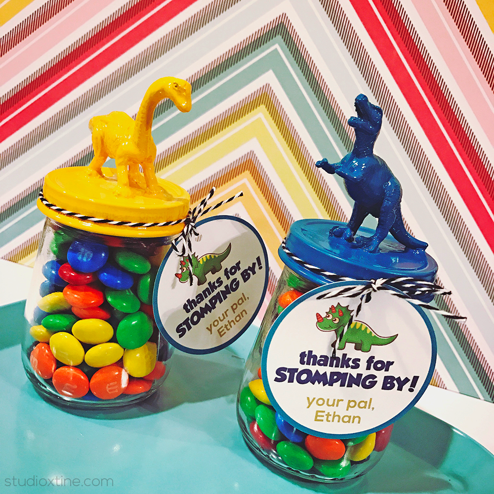 I was inspired by Pinterest to make these party favors. Duh, where else? Don’t the favor tags complete the look of the favors by providing some visual interest? Side note: If you are going to do these dinosaur-topped baby jar favors, have major self-control when assembling the favors. The large M&M bag was so hard to resist! I may have had a couple…handfuls.