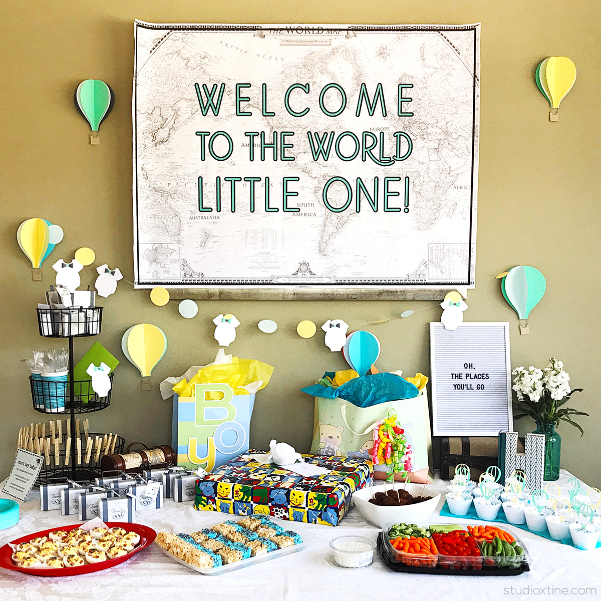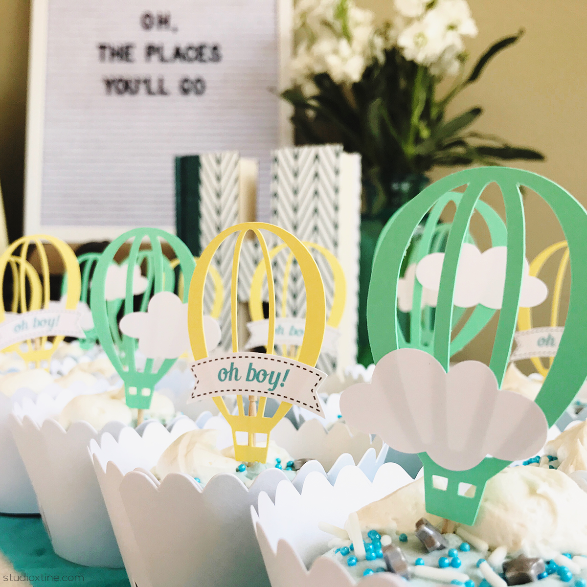 The hot air balloon icon can be seen again here on the cupcakes toppers. Personally, I like to repeat icons/patterns/colors/shapes throughout in the decor because it not only makes the entire event feel cohesive but it also reiterates the theme. These cupcake toppers were customized by using several different designs from the Silhouette Design Store. I tweaked Lori Whitlock’s Design ID#36441 to create the hot air balloon piece. The clouds are from Snapdragon Snippets’ Design ID#44219. The “oh boy” banner was created layering my own text on the banner shape in this design by Kolette Hall.