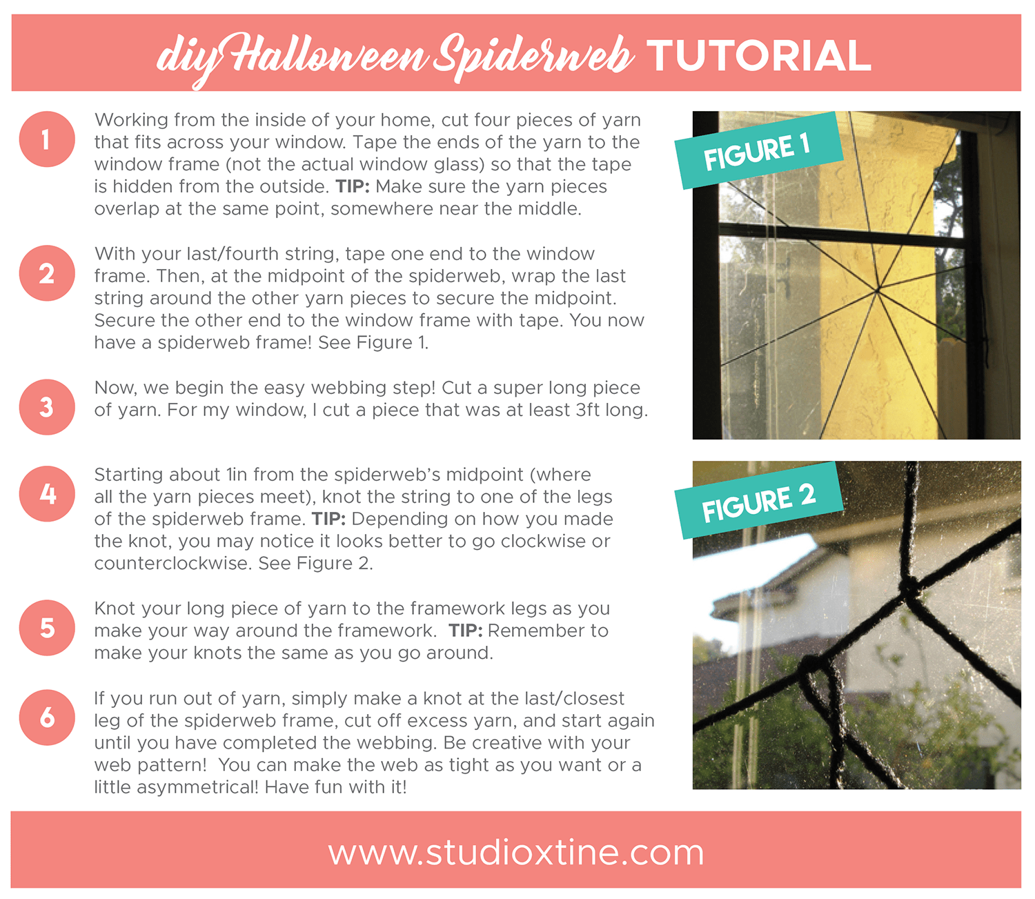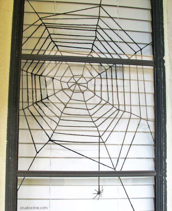 Six years ago, I had a craft blog (not this one) where I shared similar tutorials and projects like I do now. Then kids came into the picture and well…my time was spent on either wiping butts, doing the fourth load of laundry, or finally taking a shower at 8:30pm. Life is a little less hectic these days *knock on wood* so I’m back at it with crafting. One of my most popular post on my old blog was a simple and super economical DIY project showing how to make spiderwebs out of black yarn. It was even featured on Apartment Therapy! For about $3 or less, you can have instant spooky spiderwebs in your windows in no time!