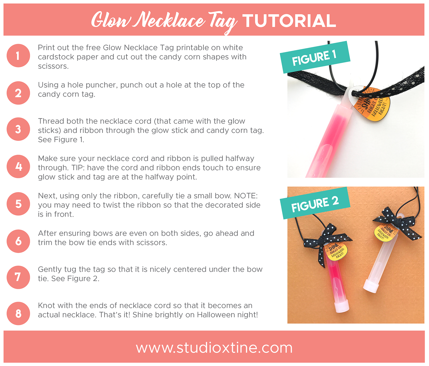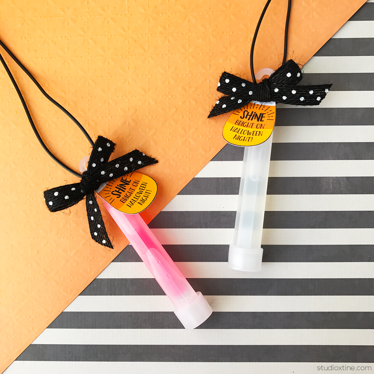 To go along with the glow necklaces, I designed these adorable candy corn-shaped favor tags that read “Shine bright on Halloween Night!” You, too, can make these super simple goodies by downloading today’s FREEBIE! Below is a super quick tutorial with supplies that you probably already have at home!