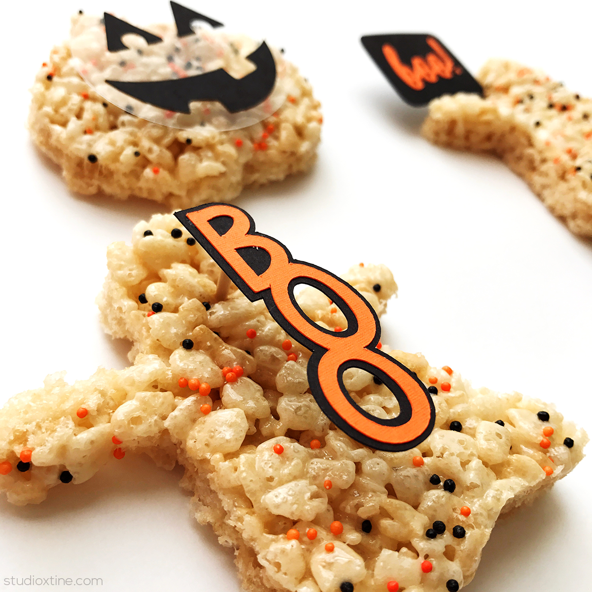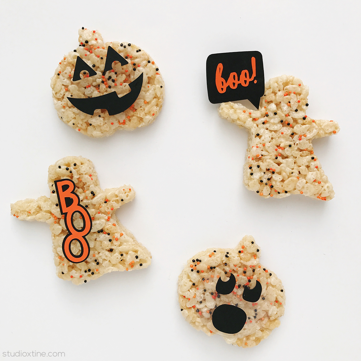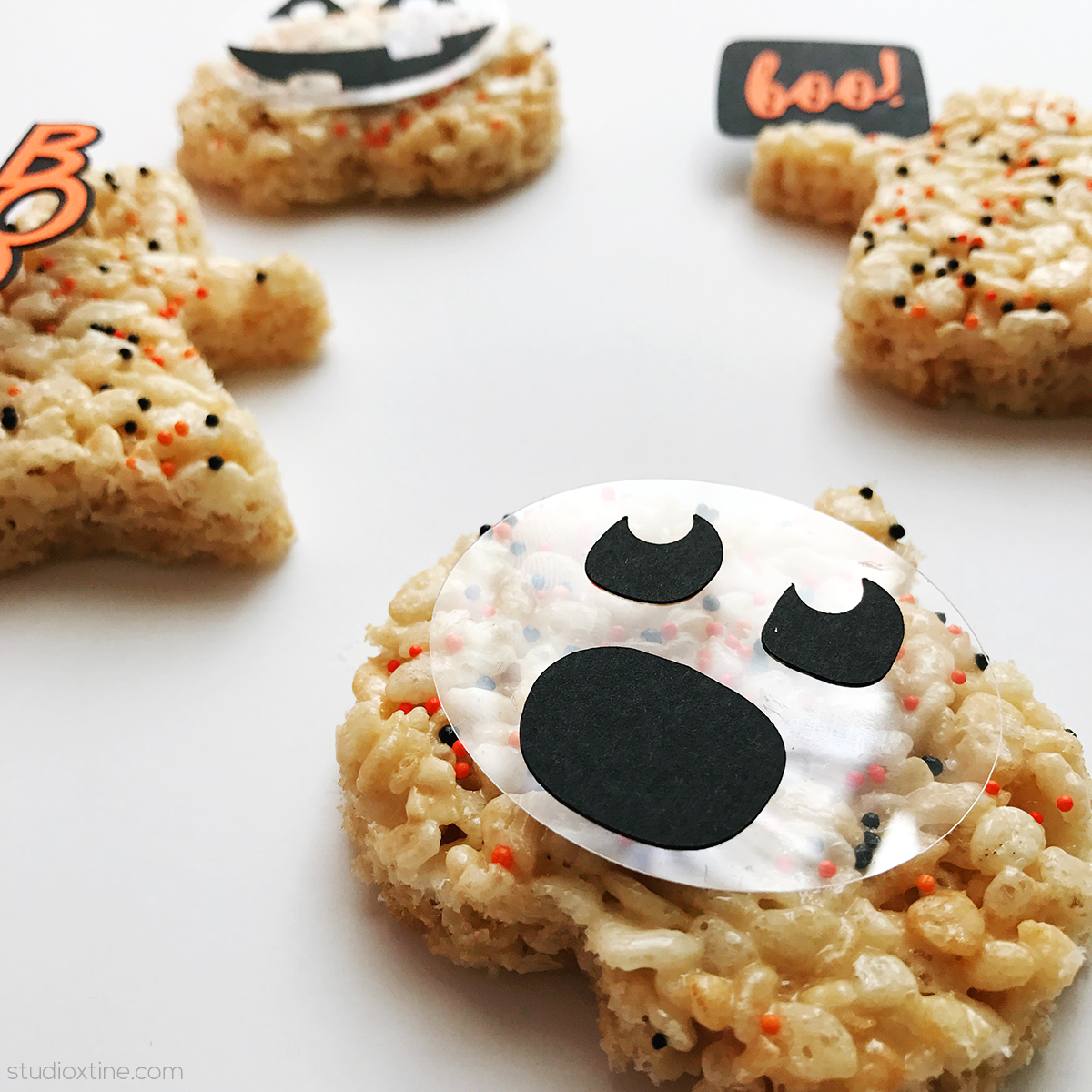 The “boo!” speech bubble is Design ID#152644. A toothpick was glue to the back of the topper and inserted into the side of the rice krispie ghost cutout.
