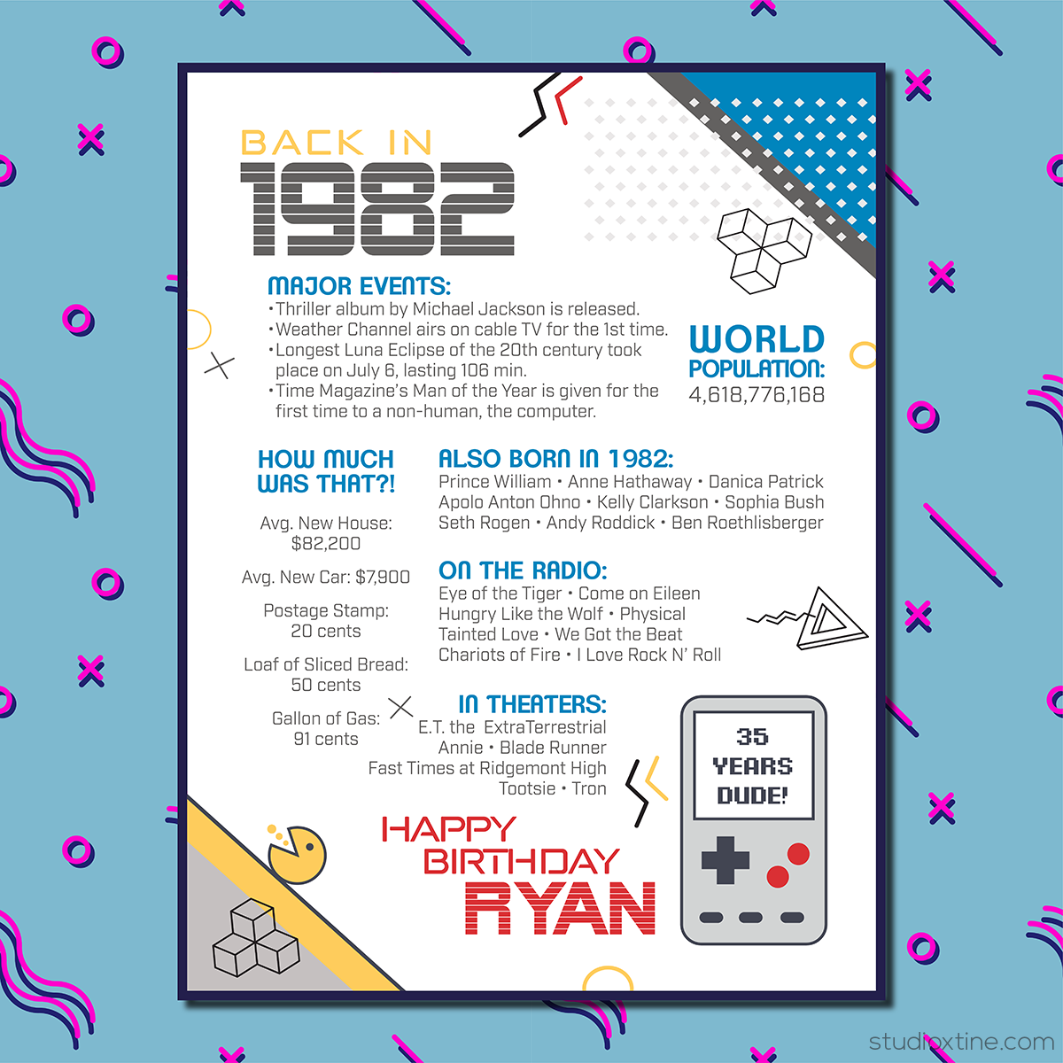 Another element I like to add to parties are printed goods, primarily because I love to design them. For Ryan’s grandfather’s 80th birthday earlier this year, we made a “Back in <insert birthyear>” sign that was quite the hit! So, I replicated the idea, incorporated the trending Memphis patterns, and found some fun stats for the year 1982. Everyone loved reading it!