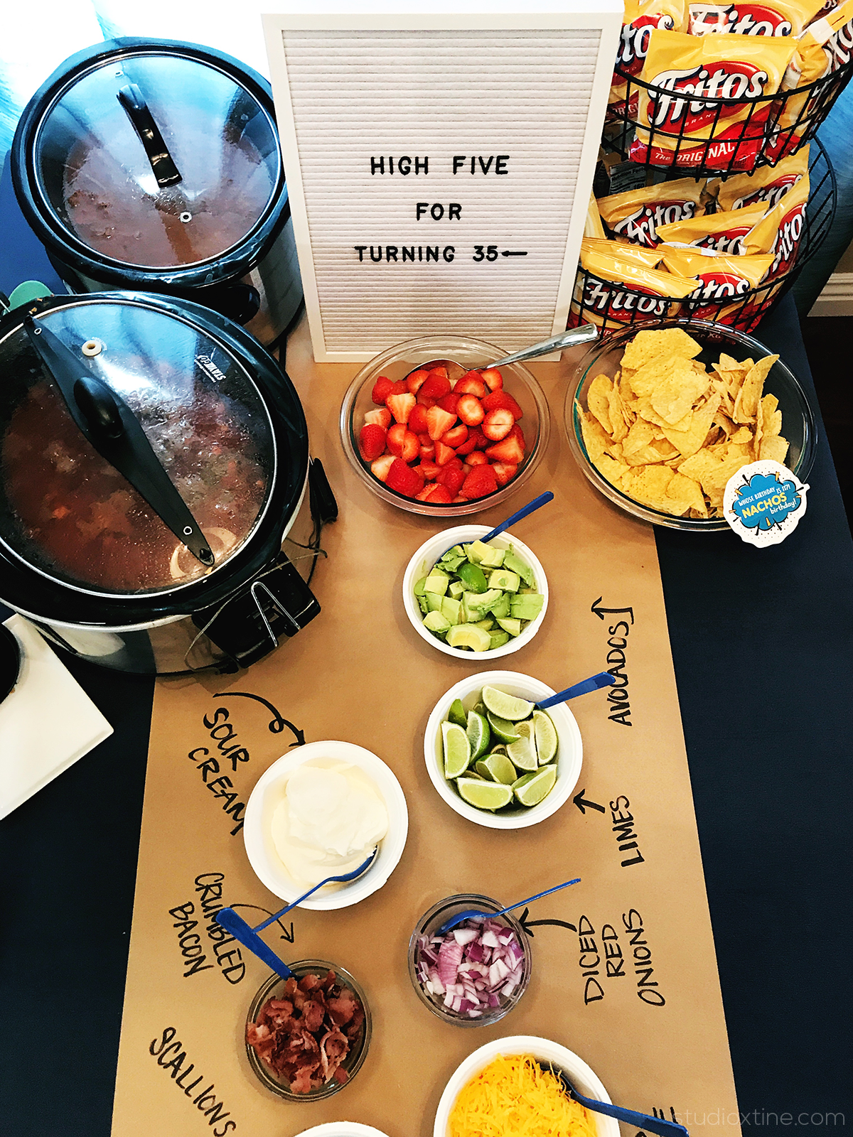 The centerpiece of this party was the DIY chili bar because food is of utmost importance! Our guests ranged from babies to preschoolers to adults so I felt that the chili bar would work for all. Would you believe me that the first type of bar I was thinking for a party was a poke bar?? How cool would that be?! Oh well, another time, another party!
