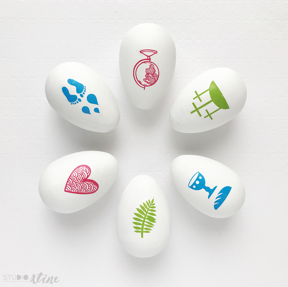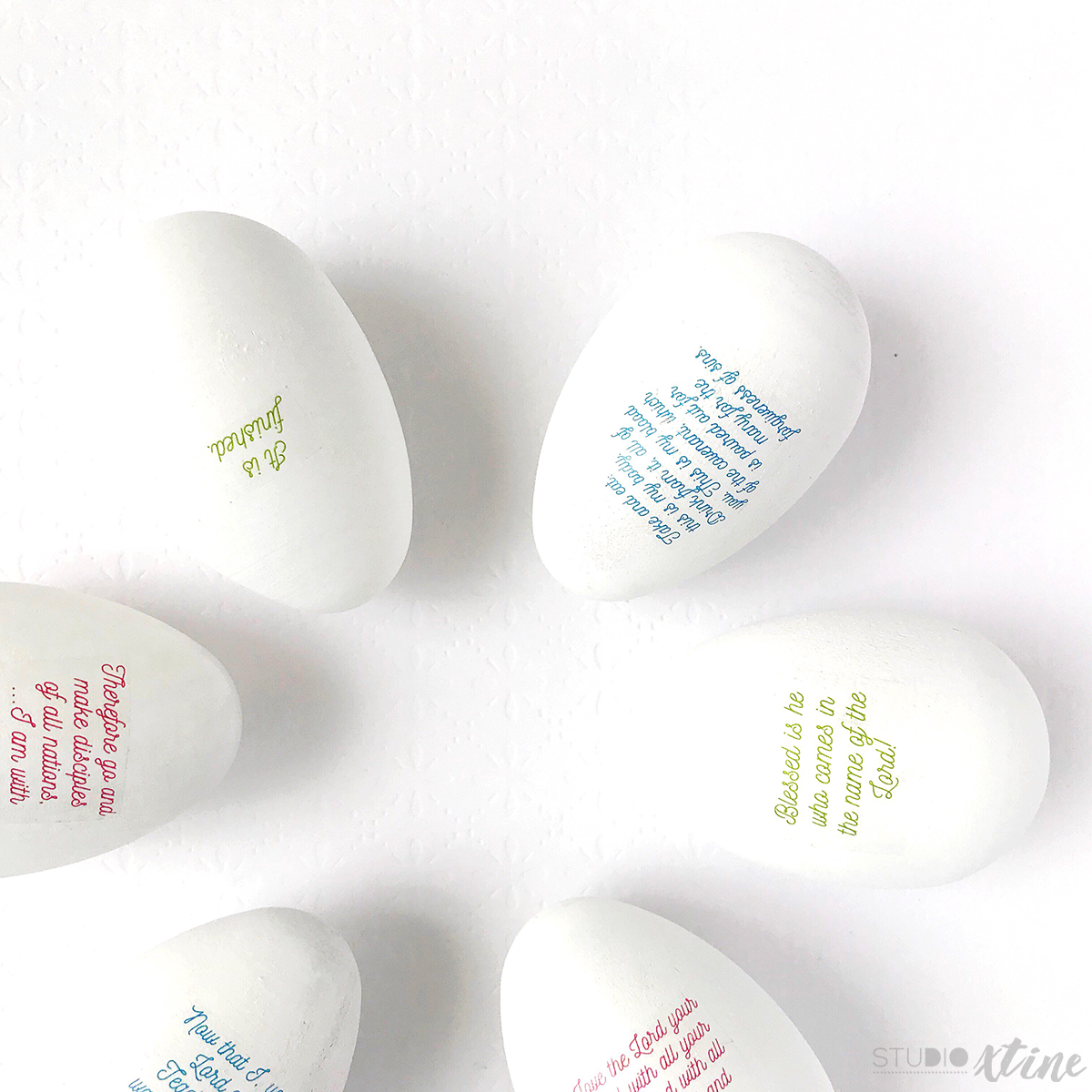 - Lastly, follow the Temporary Tattoo Paper instructions (printed and stuck on the adhesive layer) and adhere the tattoos onto the dried wooden eggs. Symbols on the front side and verses on the back side.